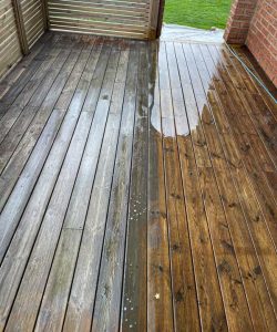 Det rekommenderas inte. Högtryckstvätten river upp fibrerna och gör att träet kan börja flisa sig. Har du mycket smuts, använd istället varmt vatten, såpa och en styv borste. Det är skonsammare, effektivare – och bättre för träets livslängd.