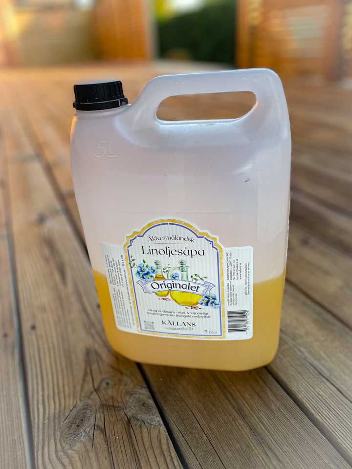 När altanen är riktigt ren och torr eller åtminstone fuktig men sugs upp soapa, är det dags för steg två: kallbehandlingen med såpa. Blanda 1 liter överfettad såpa i 10 liter kallt vatten i en hink. Vattnet ska kännas “fett” – lagom såpbubbligt, men inte rinnande som diskvatten.