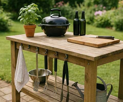 En bra grundregel är att göra bänken i en höjd som passar dig när du står och arbetar. Mät din köksbänk inne och utgå från den höjden. Tänk också på att lämna plats för att kunna förvara saker under bänken – som grillverktyg, skärbrädor eller kastruller.