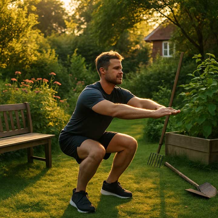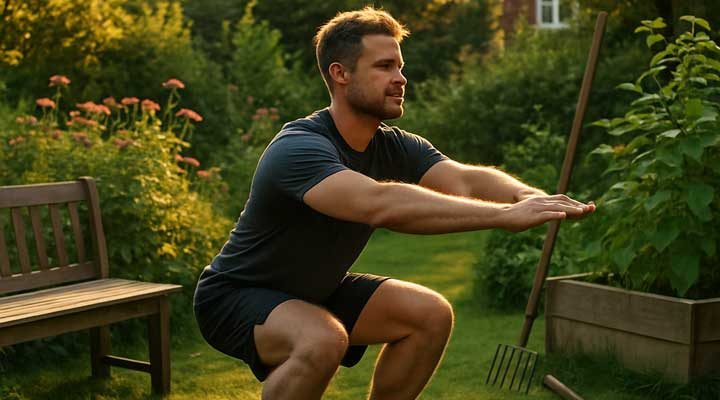 När du är ute i trädgården har du en perfekt arena för att träna med kroppen som redskap. Funktionella övningar, som tränar flera muskelgrupper samtidigt, passar utmärkt här. Ett enkelt men effektivt upplägg består av fem grundövningar: knäböj, utfall, armhävningar, plankor och burpees. Alla dessa kan anpassas i svårighetsgrad och utföras var som helst.